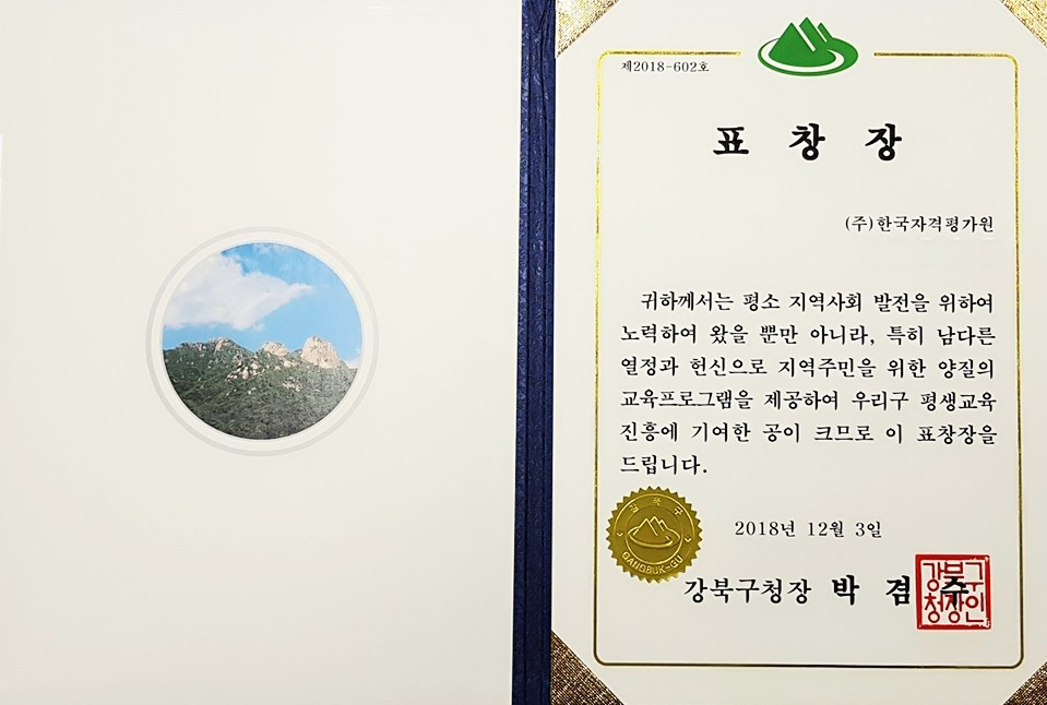 2018년 12월 3일 강북구청주관으로 박겸수구청장님께 강북구 평생교육 발전에 공로를 인정받아 한국자격평가원이 표창장을 받았습니다.